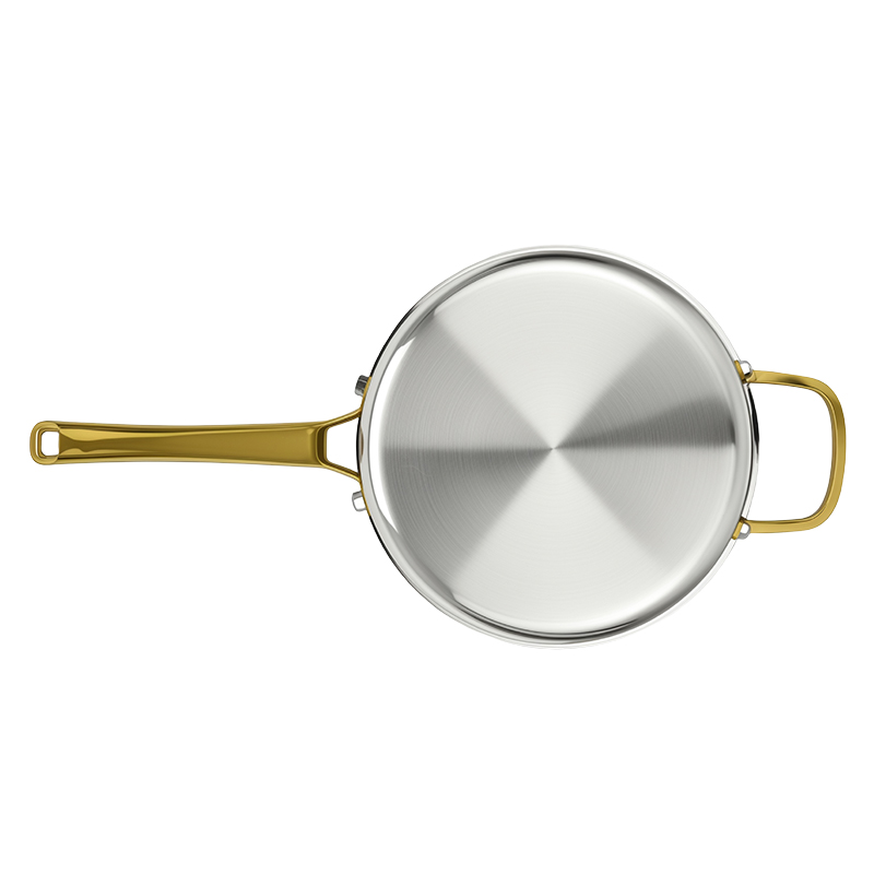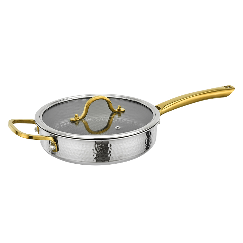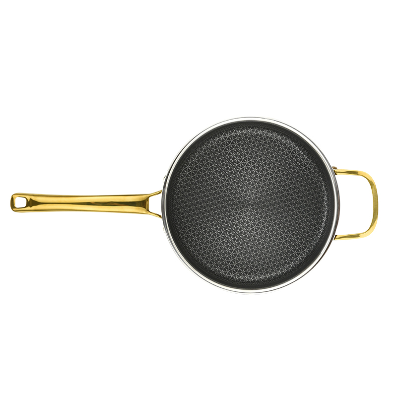 El mango de acero inoxidable, tratado con tecnología PVD (deposición física de vapor), irradia un ambiente elegante y estilizado. Complementa perfectamente el revestimiento de panal grabado exterior e interior martillado de la sartén, resaltando aún más la calidad superior y la estética refinada del producto.